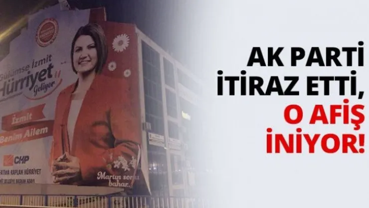 CHP'nin İzmit Belediye Başkan adayı Fatma Kaplan Hürriyet'in Carrefour Köprüsü'nün hemen dibinde bulunan Kocaeli Barosu'na ait binaya sabaha karşı astığı afiş AK Parti'nin itirazı üzerine indirilecek.