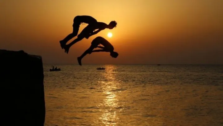 Gençlerin adrenalin dolu anları ise fotoğraf karelerine yansıdı. Günbatımında gençlerin denize atlayışı kartpostallık görüntüler oluşturdu