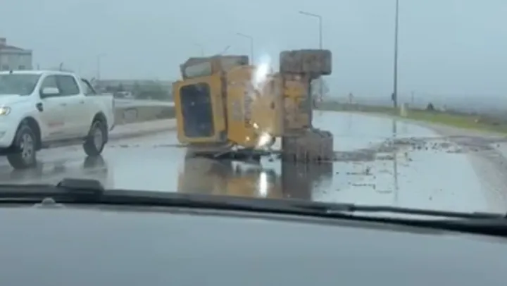 Alınan bilgilere göre ıslak ve kaygan zeminde direksiyon hakimiyeti kaybolan iş makinası yan yatarak devrildi. Kazada sürücü yaralanmadan kurtulurken, devrilen iş makinası kurtarıcı yardımıyla alındı.