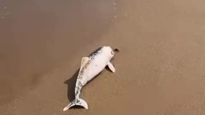 Kocaeli'nin Kandıra Sarısu Plajı'nda karaya vurmuş ölü yunus yavrusu cep telefonu kamerasıyla görüntülendi.