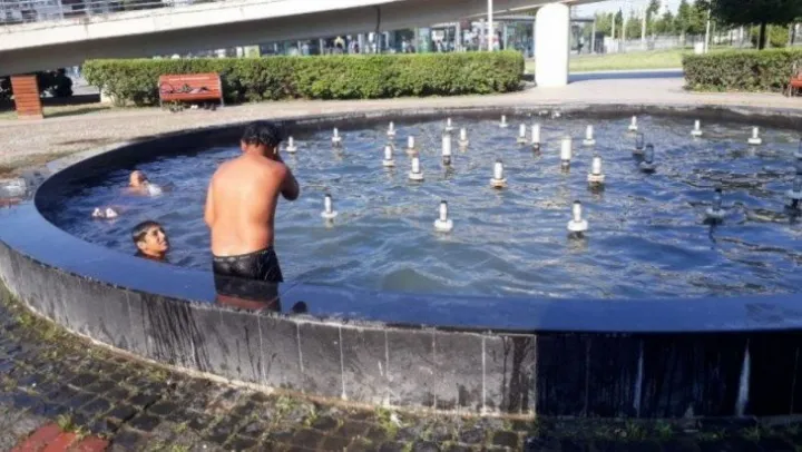 İzmit'te çocuklar, sıcak havada bunalınca serinlemek için tehlikeye aldırmadan elektrik akımı bulunan süs havuzunun içine yüzdüler.
