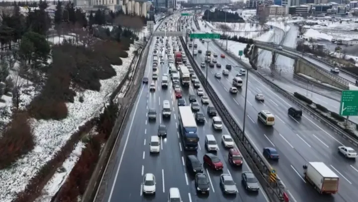 İstanbul'da gece etkili olan kar yağışı kent genelini olumsuzsuz etkiledi. Akşam saatlerinde İstanbul genelinde trafik yoğunluğu yüzde 47'ye ulaştı. TEM Otoyolu Mahmutbey Gişeleri'nde trafik havadan görüntülendi.