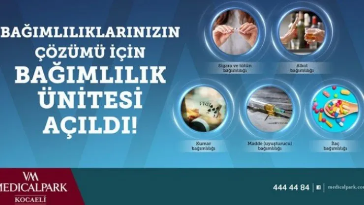 VM Medical Park Kocaeli Hastanesi'nde hizmete giren Bağımlılık Ünitesi'nde sigara, tütün, alkol, madde (uyuşturucu madde), kumar ve ilaç bağımlılığı tedavisi yapılacak.