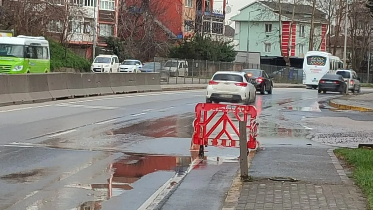 D130 karayolu Gölcük merkeze Kerimağa rampası tarafında giriş yapıldığında yol üzerinde biriken yağmur suyu trafik kazasına sebep olabilir