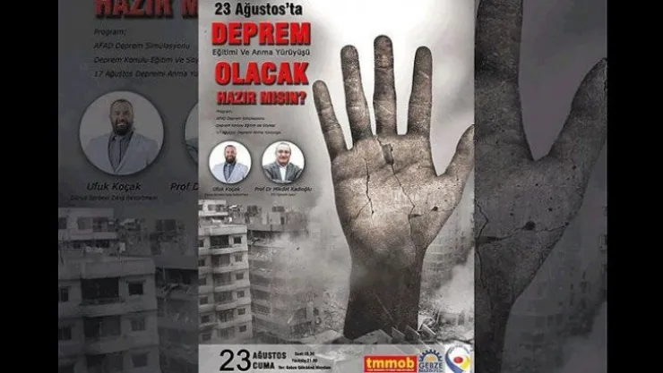 17 Ağustos Depreminin 20. yılında TMMOB'a bağlı odaların Gebze temsilcilikleri, Gebze Belediyesi ve Gebze Ticaret Odası'nın katkıları ile 23 Ağustos'ta 'Deprem Eğitimi ve Anma Yürüyüşü' gerçekleştirilecek.