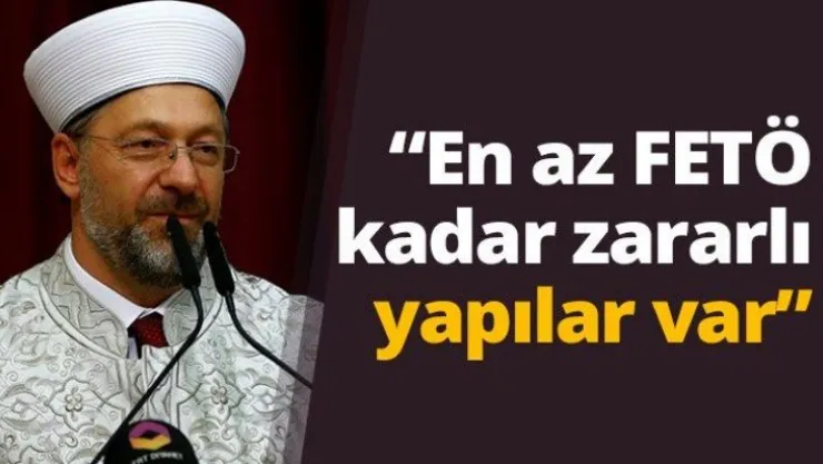 Diyanet Başkanı Ali Erbaş, 'Sadece FETÖ ve DEAŞ değil bizim problemimiz. Belki o yolda olan, belki en az bunlar kadar zararlı olan hurafelerle, rüyalarla menfaat temin edip bunu geçim haline getiren yapılarla büyük bir mücadelemiz var' dedi. Diyanet İşleri Başkanı Ali Erbaş, Başkanlık Konferans Salonu'nda düzenlenen "dini istismar eden terör örgütleriyle mücadele" konulu panelin açılışına katıldı. Erbaş, dinin istismar edilmesi ile ilgili, "Sadece FETÖ ve DEAŞ değil bizim problemimiz. Belki o yolda olan, belki en az bunlar kadar zararlı olan hurafelerle, hikayelerle, rüyalarla menfaat temin edip, adeta bunu geçim haline getiren yapılarla, şahıslarla büyük bir mücadelemiz var ve devam edecek" dedi Diyanet İşleri Başkanlığınca FETÖ ve DEAŞ'ın dini istismar ettiklerine ilişkin tespitlerin yer aldığı kitapçıktan 500 bin basılarak vatandaşlara ulaştırıldığını anlatan Erbaş, "Sadece FETÖ ve DEAŞ değil bizim problemimiz. Belki o yolda olan, belki en az bunlar kadar zararlı olan hurafelerle, hikayelerle, rüyalarla menfaat temin edip, adeta bunu geçim haline getiren yapılarla, şahıslarla büyük bir mücadelemiz var ve devam edecek" şeklinde konuştu.