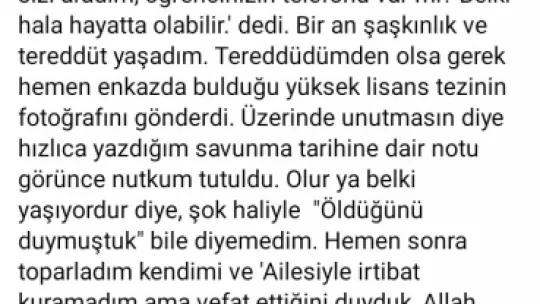 Ayrıca Zeynep Parlar Polat’ın oturduğu binanın enkazından yüksek lisans tezi çıktı. Tezin üzerinde ismi yazdığı için ekipler tarafından şu an Karamanoğlu Mehmet Bey Üniversitesi’nde rektör yardımcılığı görevi yapan Parlar’ın danışman hocası Prof. Dr. Hüseyin Muşmal’a ulaşıldı. Enkazdan çıkan tezin fotoğrafını yayınlayan Muşmal, “Ellerim titreyerek yazıyorum. Biraz önce telefonum kayıtlı olmayan bir numaradan arandı. Arayan ses Hatay’dan aradığını ve kurtarma personeli olduğunu söyledi. İsmimi teyit etti ve hızlıca ‘Zeynep Parlar Polat adında bir öğrenciniz var mı?’ diye sordu. Sesim titreyerek ‘Evet’ dedim. ‘Şu anda enkazda bir yüksek lisans tezi buldum. Numaranızı bularak sizi aradım, öğrencinizin telefonu var mı? Belki hala hayatta olabilir’ dedi. Tereddüdümden olsa gerek hemen enkazda bulduğu yüksek lisans tezinin fotoğrafını gönderdi. Üzerinde unutmasın diye hızlıca yazdığım savunma tarihine dair notu görünce nutkum tutuldu. Olur ya belki yaşıyordur diye, şok haliyle ‘Öldüğünü duymuştuk’ bile diyemedim. Hemen sonra toparladım kendimi ve ‘Ailesiyle irtibat kuramadım ama vefat ettiğini duyduk. Allah rahmet eylesin’ diyebildim. Hala enkazdan canlı bulma umudundaki kardeşim vakit kaybetmesin diye fazlasını diyemedim. ‘Acaba hayatta mı’ vesveseleri arasında düşünürken dönem arkadaşlarından aldığım bir mesajla öğrencimin bugün toprağa verileceğini öğrendim. Ah benim öğrencim onca emek verdiklerin arasında, yarınlara yalnızca tezini mi bıraktın?” ifadeleriyle duygu dolu bir paylaşıma imza attı.