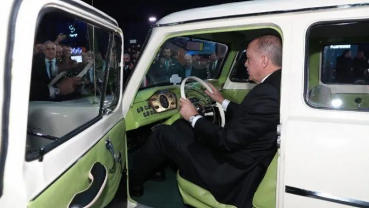 Cumhurbaşkanı Erdoğan, lansman öncesinde Türkiye'nin 1960'lı yıllarda ürettiği Devrim marka otomobilin direksiyonuna geçti.