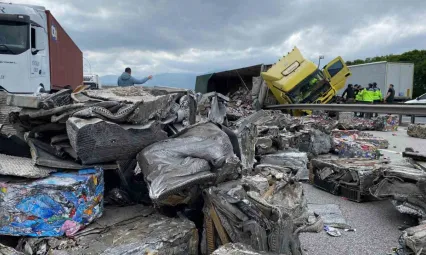 Mıcır yüklü kamyonun damperi devrildi, sürücü bayıldı