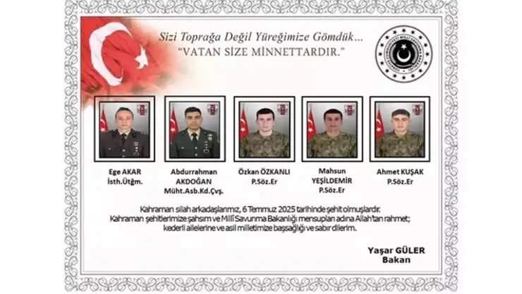 MSB, şehit olan askerlerin isimlerini paylaşarak taziye mesajında bulundu. Bakanlıktan yapılan açıklamada şu ifadeler yer aldı: Ege Akar, Abdurrahman Akdoğan, Özkan Özkanlı, Mahsun Yeşildemir, Ahmet Kuşak, kahraman silah arkadaşlarımız, 6 Temmuz 2025 tarihinde şehit olmuşlardır.