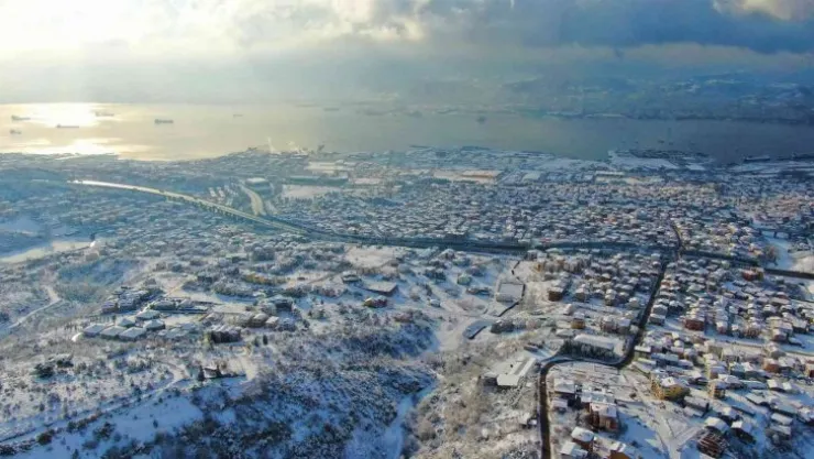 Kocaeli’de etkili olan kar yağışı kentin her bölgesini beyaza bürüdü. Kar yağışı sonrası Kocaeli’den kartpostallık görüntüler oluşurken ağaçlar, evlerin çatıları, araçların üstleri beyaza büründü. Deniz ile kar manzarasının aynı kareyi paylaşması görsel bir şölen sundu. Oluşan kartpostallık kar manzaraları havadan drone ile görüntülendi.