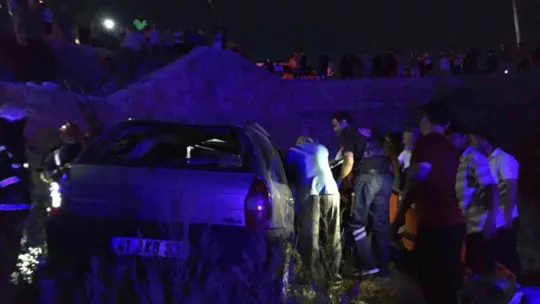 Kocaeli'nin Körfez ilçesinde hafriyat kamyonuyla çarpışarak takla atan otomobil, 15 metrelik istinat duvarından uçtu. Feci kazada 2 kişi yaralandı.