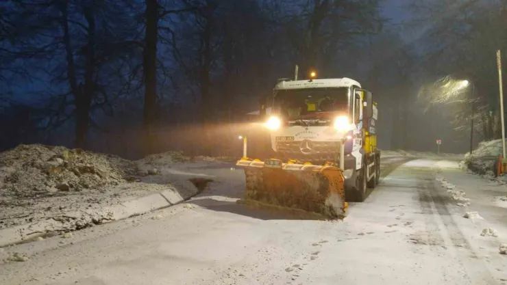 Kocaeli’de karla mücadele ekipleri, kar yağışının sürdüğü yüksek kesimlerde küreme ve tuzlama çalışmalarına aralıksız devam ediyor.
