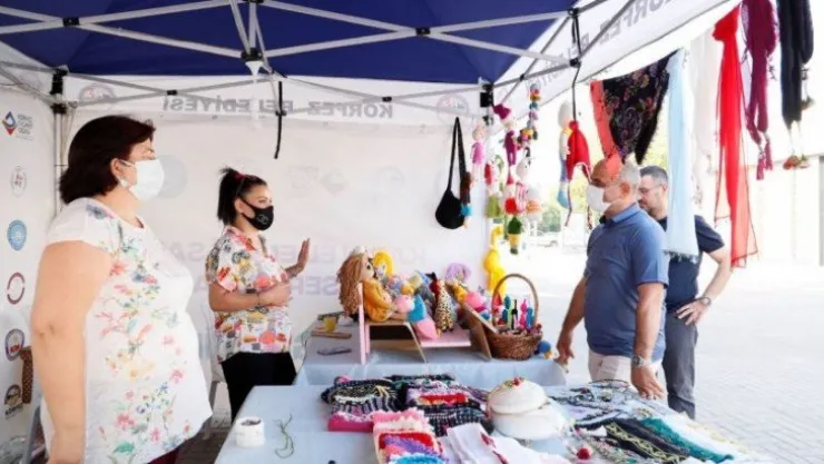 Körfez Belediye Başkanı Şener Söğüt, Tütünçiftlik sahilinde bulunan Kadın El Emeği Satış ve Sergi Alanı'nı gezdi, stantları gezerek kadınlarla sohbet etti