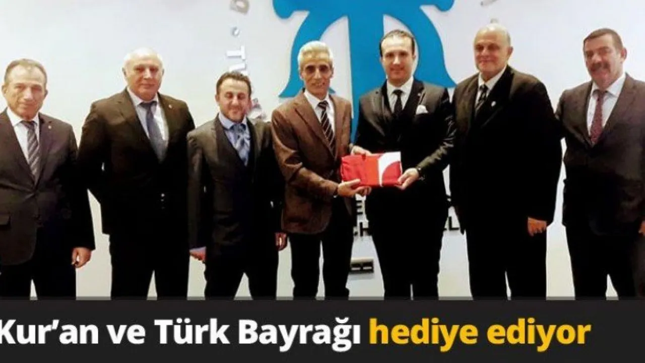İlçe Başkanı Zeki Gürsu ve meclis üyesi adaylarıyla ziyaretleri gerçekleştiren Azmi Cihat Hatipoğlu, yapılan sohbet sonrasında hediyelerini takdim ediyor. Bu ziyaret kapsamında Denizcilik Odası Kocaeli şube Başkanı Vedat Doğusel’ede giden Hatipoğlu ve Gürsu, Türk Bayrağı ve Kur’an hediye ettiler. İki değerli hediyeyi alan Doğusel, öperek emanetleri kabul etti.