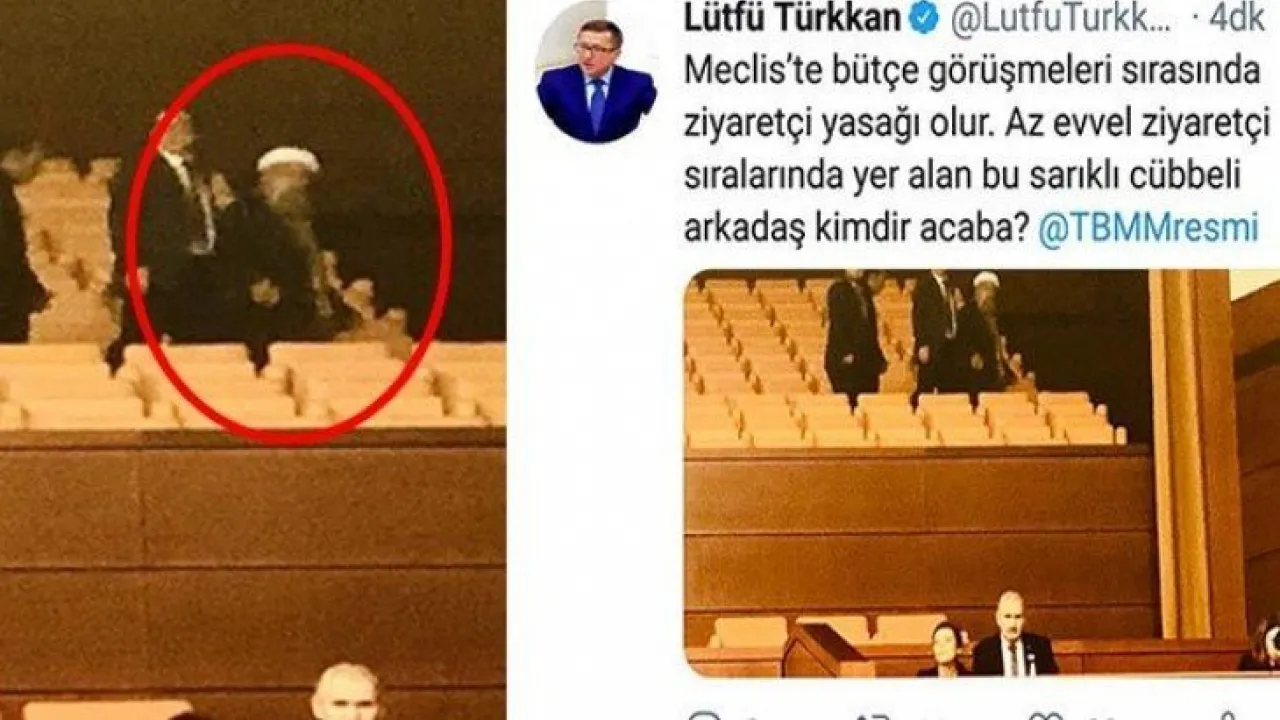 TBMM'de Genel Kurul’da bütçe görüşmeleri sürerken İYİ Parti Grup Başkan Vekili Kocaeli Milletvekili Lütfü Türkkan, dikkat çeken bir paylaşımda bulundu. Bütçe görüşmelerinin olduğu 12 gün boyunca ziyaretçi yasağına dikkat çeken Türkkan, TBMM locasında çekilmiş bir fotoğrafı paylaştı. Türkkan, fotoğrafın altına “Meclis’te bütçe görüşmeleri sırasında ziyaretçi yasağı olur. Az evvel ziyaretçi sıralarında yer alan bu sarıklı cübbeli arkadaş kimdir acaba” diye sordu.