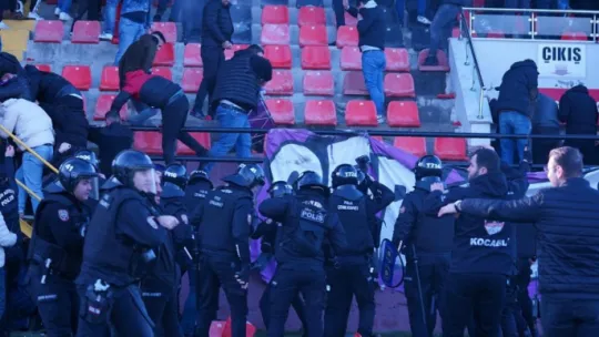 Kocaeli'de Bölgesel Amatör Lig maçında ortalık karıştı. Taraftarlar kırdıkları koltukları sahaya fırlatırken, polis ekipleri biber gazıyla müdahale etti. O anlar amatör kameralar tarafından kaydedildi.