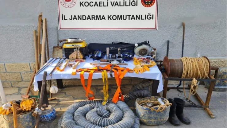 Edinilen bilgiye göre, İl Jandarma Komutanlığı ekipleri, Kandıra’daki ormanlık alanda 5 şahsın izinsiz kazı yaptığını tespit etti. Şahıslar, jandarma ekipleri tarafından suçüstü yakalandı. Kazı alanında anfora (küp) parçası, detektör, jeneratör, havalandırma fanı, 20 metre havalandırma borusu, 2 gaz maskesi, 2 şarj adaptörü, projektör, piknik tüpü, ip makarası düzeneği, 3 kürek ve 5 kazma ele geçirildi. 5 şahıs hakkında işlem başlatıldı.
