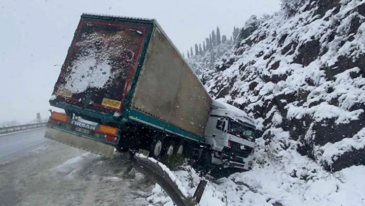 Kocaeli'nin Körfez ilçesi TEM Otoyolu'nda sürücüsünün direksiyon hakimiyetini kaybettiği tır yoldan çıktı. Demir bariyerleri kıran tır, yolun kenarında asılı kaldı.