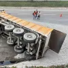 TEM Otoyolu'nda mıcır yüklü kamyon devrildi