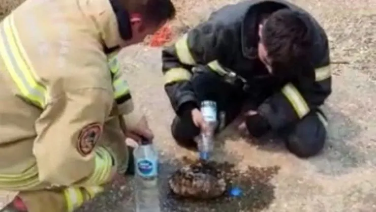 Antalya Manavgat'ta çıkan orman yangınları için Kocaeli'den bölgeye giderek alevlerle mücadele eden itfaiye erleri, alevlerin arasından kurtardıkları kaplumbağaya elleri ile su verdi