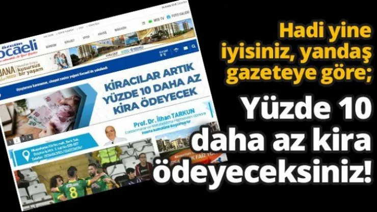 Sunuldu sunulmasına ama yıllarca bu kentin ekmeğini yiyenler yine bu kentin insanlarını kandırmaktan vazgeçmiyor! Bir kaç sene önce AKP'li müteahhit Haldız Gruba satılan ve o dönemden sonra yaptığı yandaş haberlerle zaman zaman insanların tepkisini üzerine çeken Özgür Kocaeli isimli gazete bir skandal habere daha imza attı. Özgür Kocaeli Gazetesi, meclise kira artışıyla ilgili olarak sunulan yasa tararısını "Kiracılar artık yüzde 10 daha az kira ödeyecek" şeklinde okurlarına sundu. Bununla da yetinmeyen gazete üstüne basa basa yaptığı haberin içeriğinde de "Teklife göre, kira artışı ÜFE yerine TÜFE’ye göre belirlenecek böylece kiracıların yüzde 10 daha az kira ödemeleri hedefleniyor." dedi. Bu tip haberlerle iktidara yaranmak için elinden geleni yapan gazete vatandaşları yine aptal yerine koyarak attıkları başlıkla ve haberin içeriğiyle algı oluşturmaya çalışıyor. Bu yandaş gazeteye göre vatandaşlar yüzde 10 daha az kira ödeyecek. Meclise sunulan yasa tasarısının doğrusu ise kira artışı ÜFE yerine TÜFE’ye göre belirlenecek.